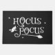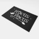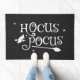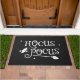 Black and White Witch Hocus Pocus Halloween Doormat, Welcome your guests with this cute spooky funny elegant personalized Halloween doormat. The stylish typography design features "Hocus Pocus" wording white, white witch broomstick, sparkling star, and white witch, in black background.