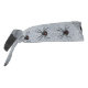 This tie back head band is a white textured look fading to black at the ends with a black triangular spider web that has a black widow spider with the red hourglass marking in the center. More spiders are on each side of the web.