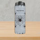 This thermal tumbler bottle to keep your drinks cold or hot has a white and black painted textured look with a black spider web shaped like a triangle with black widow spiders with red hourglass markings. Customise your text with the template.