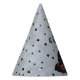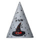 This paper party hat is white covered in little black stars with a black witch hat that has a silver buckle on an orange sash and stars. A cute spider with big eyes is hanging from the tip of the hat. Customize your text with the template.