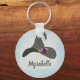 Create a personalized gift with a witchy look and a Halloween feel. This keychain features an illustration of a witch's hat in charcoal gray and black decorated with flowers in purple, magenta and lavender set against a light blue painted background. It's ready to be personalized with a name below in script lettering.