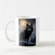 A majestic black wolf with piercing yellow eyes stands on a snowy mountain peak, gazing intently at the viewer. The wolf's fur is thick and dark, contrasting sharply with the white snow and the bright yellow moon in the background. The scene is bathed in a soft, ethereal light, creating a sense of mystery and wonder. Perfect gift for wolves and wildlife lovers.