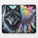Illustration of a wolf with glowing eyes next to a colorful dreamcatcher, set against an awe-inspiring cosmic backdrop, evoking mystery, spirituality, and a connection to nature and dreams.