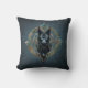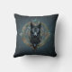 Black wolfs head with piercing blue eyes, set against a circular, ornate background. The background is a complex design of gold and iridescent patterns, resembling a magical symbol. The wolf's fur is detailed with intricate lines and shading, giving it a mystical and powerful presence.
