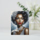 Postcard features painting of a gorgeous dark-skinned woman in the Old Hollywood aesthetic style. She has red lips and wears silver dress with diamond jewelry and hair accessories. A dramatic, ethereal beauty glamour portrait.