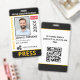 Medium sized 3"x5" vertical press ID with eye-catching yellow as the accent color. Add photo, your news publication logo, the reporter's name, title, the badge ID number and more. This Press ID is in a slightly larger size for easy visibility. Add your QR code to the back as well.