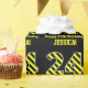 This attention-grabbing, bold, birthday-themed wrapping paper design features a large number "24", with a yellow and black striped pattern. It also features the message "Happy 24th Birthday,", and a personalized name. The background is colored black. Fun wrapping paper like this might be used when wrapping presents being given to somebody in celebration of their 24th birthday. [~Z0000381]