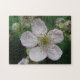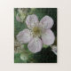 This awesome puzzle features a photograph of a white blackberry flower. The photo was taken using macro photography for a detailed result. You can see the fine detail like the pink tinge on the white petals.