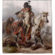 A Blackfoot Indian dressed in deer skin, eagle feathers and wearing war paint with a rifle in his hand rides a white nicely decorated Arabian Horse being chased by settler on horseback. The horse looks to be wearing a bear skin saddle and has different leather, bead and feather decor. A painting from life by Karl Bodmer of a Blackfoot warrior ca. 1840-1843