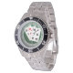 Has heft and feel of expensive stainless steel quartz watches. Good band with safety catch. I removed links, which is easy because engraved arrows show direction to push the linking pins. As always by this seller, the image (a railroad logo) is a perfect reproduction of my emailed image, and is precisely spaced and aligned.