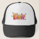 Calling all Blair! This adorable trucker-style baseball cap features a fun, personalized graphic on the front panel. The name "Blair" is spelled out in bubbly, sunset-colored letters decorated with wildflowers and cute honeybees.