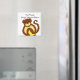A funny magnet with a cool looking monkey holding bananas. A funny saying... " the monkey always takes the blame"