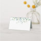 This blank place card features painted watercolor eucalyptus, botanical green, and light blue leaves.