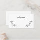 This place card features black hand drawn rustic laurels with word 'welcome' in modern script font style on plain white card.