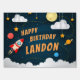 Direct birthday party guests to your location, or encourage drive-by visitors with this cute outer space themed lawn sign that matches our Blast Off kids birthday collection. Design features "Happy Birthday [Name]" in orange comic book lettering on a night sky background with planets, stars, the moon, clouds, and a rocket ship.