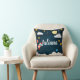 Cool space themed throw pillow for your little explorer's room features their name in white script lettering, surrounded by a rocket ship, stars, planets and clouds on a navy blue night sky background.