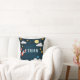 Cool space themed throw pillow for your little explorer's room features their name in white lettering, surrounded by a rocket ship, stars, planets and clouds on a navy blue night sky background.