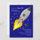 Begin your space birthday party with this Blasting Off invitation. The blue background has a fiery rocket ship and dazzling stars.