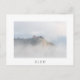 Postcard of historic Bled castle, built upon the rocks along Lake Bled, surrounded by clouds and ground fog, like it is a castle built in the sky, in Bled, Slovenia with a white border and the text 'Bled'.