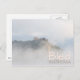 Postcard of historic Bled castle, built upon the rocks along Lake Bled, surrounded by clouds and ground fog, like it is a castle built in the sky, in Bled, Slovenia with in the lower right corner the text: 'Bled, Slovenia'.