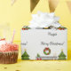 Destei's original cartoon illustration of a cute blenheim color Cavalier King Charles Spaniel breed dog. The dog is placed in a festive living room that has a fireplace. Two red stockings hang on the fireplace mantel. On the top of the fireplace there is a green wreath that is decorated with a red bow and some yellow circles as lights. On top of the mantel there are three small triangle shaped trees also decorated with yellow circles. On the other side of the mantel there are two beige candles. Next to the fireplace there is a festive green Christmas tree with two presents under it. The Christmas tree is decorated with red and yellow ornaments and a gray garland. On the top of the tree there is a yellow star. There is also a personalizable text area that now reads: "Merry Christmas!" and another personalizable text area for a name.