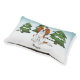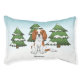 Destei's original cartoon illustration of a cute blenheim color Cavalier breed dog. The dog is placed in a winter scene. In the scene it is snowing in the background and there are three green fir trees behind the dog. The trees have some snow on them. The background is a light blue to white gradient giving this design that freezing cold winter day look. There is also a personalizable text area for a name.