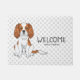 Destei's original cartoon illustration of a cute blenheim color Cavalier King Charles Spaniel breed dog who is sitting. There is also text that now reads "Welcome" together with a personalizable text area for a family name or other custom text. The background has a pattern of gray paw prints.
