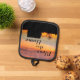 Safely handle baking trays, cookie sheets and muffin tins from the oven with this pot holder with black trim that features the photographic image of a dark silhouette of a house against a colorful sunset lit sky along with a house blessing printed in black lettering. Select your pot holder backing style. Makes a great gift for the kitchen!