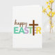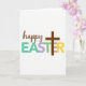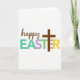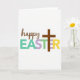 This card features a bright white background that makes the spring colors stand out, with a calm, friendly mood that feels shared between close friends. Near the top, the word “Happy” sits in a flowing brown lettering style, like a gentle note written with care. Below it, “EASTER” appears in thick, simple letters, each one in a different muted shade—teal, lavender, soft lime green, and sunny yellow—bringing a quiet sense of togetherness 🌷. One of the middle letters is replaced by a deep brown cross, rising above and below the line of the other letters. The cross is centered and slightly taller than the surrounding characters, giving the layout a steady, grounded focus. The spacing is open and airy, with the text aligned neatly in two tiers so the top word feels like it’s hovering over the rainbow-toned line 🐰. The final look is minimal, with the brown cross and the multicolored letters sitting crisply against the white space.