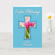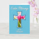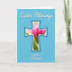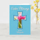 This design shows a tall cross shape centered on the card, outlined in textured deep blue with a thin white inner edge that feels like a gentle frame. Inside the cross opening sits a close-up flower in rich fuchsia, its petals softly curved and slightly overlapping as if leaning in for a quiet moment 🌷. Fine petal veins and a light glow give the bloom a tender, affectionate look, while green leaves gather around it like a supportive embrace. The background is a wide sky-blue field with very faint, watermark-like patterns that add depth without pulling attention away. Soft, diffused lighting smooths the color transitions, making the pinks and greens look calm and inviting. White flowing lettering appears above the cross and again below it, centered and easy to spot against the blue. The blue outline has a lightly textured edge, and the flower’s bright fuchsia petals sit sharply within the white border 🐇.