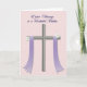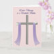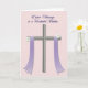 This design shows a stylized cross in muted silver-gray with a soft metallic look, centered on a pale blush-pink background with a faint geometric texture. Two flowing lavender ribbons drape over the crossbar and fall downward, their notched ends adding a gentle, dressed-up touch. Small white daisies with sunny yellow centers sit where the ribbons attach, like little floral accents placed with care 🌷. The calm colors and balanced layout create a tender, close feeling, like a quiet gesture shared between friends or loved ones. Near the top, a short message sits above the cross in flowing dark purple lettering, standing out clearly against the light backdrop. The text is centered and spaced to leave plenty of open room around the main symbol, keeping the focus on the cross and ribbons. The ribbons curve softly as they descend, with the daisies appearing crisp and bright against the lavender fabric 🐇.