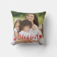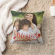 Holiday Blessings | Holiday Photo Throw Pillow - Red. Elke Clarke © Other styles and colors available at www.zazzle.com/epclarke. Red script font with the word " Blessed" with hearts photo overlay design. A perfect way to showcase your treasured family photo. A holiday gift or everyday gift for your family and friends.