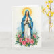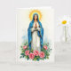 This design shows a serene woman centered on the card, standing quietly with her eyes lowered as if lost in a gentle, caring thought. She wears a glowing white gown draped with a deep blue mantle, both edged with thin gold trim that falls in soft folds around her. Her hands are clasped at chest level, and the calm pose suggests a tender, comforting presence, like a friend staying close in a quiet moment 🌷. Above her head, a golden sunburst halo spreads outward in warm rays that softly light her face and clothing. Along the bottom, a thick cluster of pink roses with green leaves and curling stems forms a natural base, adding a romantic touch through their full petals and close-packed arrangement 🐇. The background is washed in pale blues and greens that resemble distant clouds or soft foliage, keeping the focus on the figure and flowers. Any greeting text would sit near the top in small gold lettering, leaving the roses and blue mantle to frame the lower half of the scene. The roses show layered petals and fine stems against the smooth finish of her gown and the radiating gold halo.