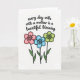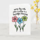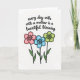 This greeting card features a bright white background with a balanced layout that feels gentle and affectionate ❤️. Across the upper half, a flowing black handwritten-style line reads, “every day with a mother is a beautiful blessing,” with the text centered and easy to spot. The smooth curves and slightly uneven ink strokes give it a tender, human touch, like a note left on the kitchen table. Below the words, three simple five-petal flowers sit side by side, adding a friendly, close-knit feel 🌼. Each flower is outlined in black and filled with a soft pastel shade—one pink, one sky blue, and one lime green—suggesting a sweet, caring bond in their shared arrangement. The blooms rest on slender green stems with small angled leaves, leaving plenty of open white space around them. Each flower has a darker circular center ringed inside the petals, with the stems clustered neatly beneath the centered text.