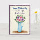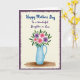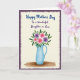 This card features a sky-blue pitcher at the center, painted with soft, watery shading that suggests a smooth ceramic feel. From the opening rises a bouquet of daisy-like flowers in bright pink and gentle lavender, each with a sunny yellow center that feels like a small wink of affection ❤️. Emerald-green leaves spread around the blooms, giving the arrangement a full, welcoming look, like it’s been set out for someone special. Above the illustration, the words “Happy Mother’s Day” appear near the top in a flowing, decorative style and are colored in a lively blue. Just below that, “To a Wonderful Daughter in Law” is placed in a deeper purple, adding a tender, thoughtful contrast 🌼. A thin, earthy brown horizontal brush line sits beneath the pitcher, hinting at a tabletop that steadies the scene. The background stays a creamy off-white, framed by a textured dark violet border with irregular, torn-paper-like edges.