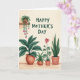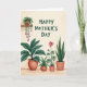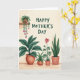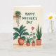 This greeting card features a cozy plant-filled scene that quietly nods to a caring bond, like a gentle hug shared between loved ones ❤️. Across the upper area on a warm cream background, the message “HAPPY MOTHER’S DAY” is placed prominently in dark green lettering. The lower portion is packed with potted houseplants in earthy terracotta containers, creating layers of greens from wide veined leaves to thin, spiky fronds. On the left side, a trailing plant with small pink blossoms spills from a higher pot sitting on a simple wooden shelf, adding a soft, affectionate movement. Near the center, a tall slender stem rises with bright red heart-shaped flowers, giving the arrangement a romantic little accent 🌼. The lighting looks soft and diffused, and the drawn textures in the leaves and pots make everything feel calm and close. Different leaf shapes and pot sizes overlap naturally, like a small indoor garden gathered with care. A cream backdrop frames the scene while terracotta pots line the bottom, with pink blossoms on the left and red heart-shaped blooms reaching upward near the middle.