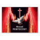 Blessed Pentecost, paper greeting card. Digital illustration of a white dove flying upwards towards a red cross. Fire and light symbolizing the spirit of God fills in the sides of the image. Art, image, and verse copyright © Shoaff Ballanger Studios, 2023.