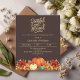 A bistre, dark brown background. Decorated with pumpkins and orange and yellow flowers. Personalize and add the party details.