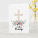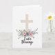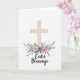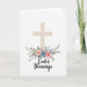 This card shows a sturdy, light-toned cross with a soft, textured look standing out against a white background. Tucked just under the crossbar is a curved floral garland that feels like a gentle embrace, hinting at closeness and care. The flowers are painted in tender blush pink and powder blue, with smaller lilac touches and leafy green sprigs curling outward like they’re reaching toward one another. The rounded petals and flowing leaves soften the straight lines of the cross, creating a calm balance between structure and warmth. Near the bottom, a short Easter message is centered and written in flowing lettering, set in a muted gray-blue that stays easy on the eyes. Plenty of open white space surrounds the artwork, letting the pastel colors breathe like a quiet spring morning 🌷. Fine shading and soft edges give the garland a watercolor feel, with tiny buds and leaf veins adding detail 🐇. The text sits just below the flowers, aligned to the center, with the cross rising above it in a gentle cream tone.