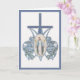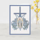 Beautiful traditional Catholic vintage image of the Blessed Virgin Mary with blue floral bouquet overlaid on "M" Marian Cross.