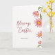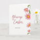 This card features a wide white background that keeps everything calm and airy, letting the message and flowers stand out. On the left, the main line “Blessings at Easter” appears in warm crimson lettering with smooth, flowing strokes, giving it a gentle, affectionate tone 🌷. Just below it, “DEAR COUSIN” is set in smaller, simpler lettering that feels close and familiar, like a quiet note between relatives. On the right side, a slender green vine drops downward, as if leaning in toward the words like a friendly companion 🐇. Along the vine, soft pink flowers with sunny yellow centers cluster in different sizes, some facing forward and others tilting slightly as if sharing a tender glance. Light green leaves fill the spaces between blooms, adding a fresh spring contrast against the white. The vine and blossoms form a vertical border on the right, with the pink petals softly shaded and the yellow centers dotted like tiny suns.