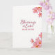 This greeting card features a bright white background that keeps the look airy and calm, like a fresh spring morning. In the upper right and lower right corners, clusters of cherry-blossom-like flowers bloom in soft pink, with gently opened petals that feel tender and welcoming 🌷. Each flower has tiny golden-yellow centers that add a warm glow, like a small spark of affection. Centered on the page, the main line reads “Blessings at Easter” in a flowing, cursive-style lettering, suggesting a close, caring note. Just below it, “DEAR SISTER” appears in a simple, neat all-caps font, giving the message a steady, friendly emphasis. Both lines are printed in a deep berry shade that ties in smoothly with the pink blossoms, creating a romantic, sisterly closeness through color harmony. The layout leaves generous open space around the words and flowers, letting the design feel gentle and unhurried 🐰. The pink blossoms sit only on the right side, with the top cluster angled slightly inward and the lower cluster curling up toward the center text.