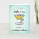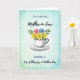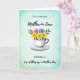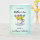 This greeting card features a white teacup and saucer at the center, with the cup tipped slightly forward as if offering a gentle gesture of care ❤️. A dark-toned handle and soft shading give the porcelain a smooth, cozy look, while the cup overflows with yellow lily-like blooms mixed with pink and pale blue daisy-like flowers. Green leaves curl between the blossoms, creating the sense of a tender, welcoming bouquet shared between close family or friends. Behind it all, a watercolor gradient fades from teal at the top to sage green at the bottom, keeping the scene calm and affectionate 🌼. Near the top, a neat, simple line of text sits above the illustration, followed by a more flowing line that reads “A Special Mother-in-Law,” both in a dark, easy-to-read color. Beneath the cup, another flowing line of text reads “A Cup of Blessings on Mother’s Day,” centered and balanced with the artwork. Subtle shadows fall under the saucer, and the background wash stays soft with a light teal-to-green transition.