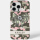 Customize this blingy pink, green and cream camouflage iPhone 15 pro max case with an olive green satin bow with a diamond center and your name in a trendy modern CAP font in dark green on cream. It's so girly, blingy and chic! Perfect for any country girl!