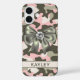 Customize this blingy pink, green and cream camouflage iPhone 16 case with an olive green satin bow with a diamond center and your name in a trendy modern CAP font in dark green on cream. It's so girly, blingy and chic! Perfect for any country girl!