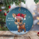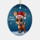 Blitzen! Cute animal reindeer character, baby deer with antlers and personalizable Santa hat with festive blue snowy backdrop. Unique winter wildlife graphic with a light snow. Round ceramic ornament, with customizable Merry Christmas written in white. for decorating your holiday tree or as a thoughtful gift, this whimsical woodland doe decor makes a cherished keepsake for years to come. Customize by changing the text, the font, the font color, or remove the text. You can even transfer this cartoon fawn illustration onto other products. Enjoy this design your way! 🎄🦌