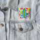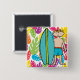 A blond haired surfer boy with a blue surfboard surrounded by tropical plants of various bright colors on a button that matches our Blond Surfer Boy invitations, postage stamps, and stickers!