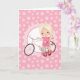This design features a cute blonde girl with her pink bicycle. On pink and white cute scallop accent background.