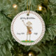 Customizable name, troop number and year for this cute, blonde, brownie in ponytails wearing a brown uniform and sash, red cookie box, standing in grass waving. A brown sunray pattern borders the ornament.