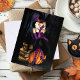 Blonde Witch sitting on a large orange pumpkin. At her side is a black cat on a pile of books. In behind is a forest and castle.